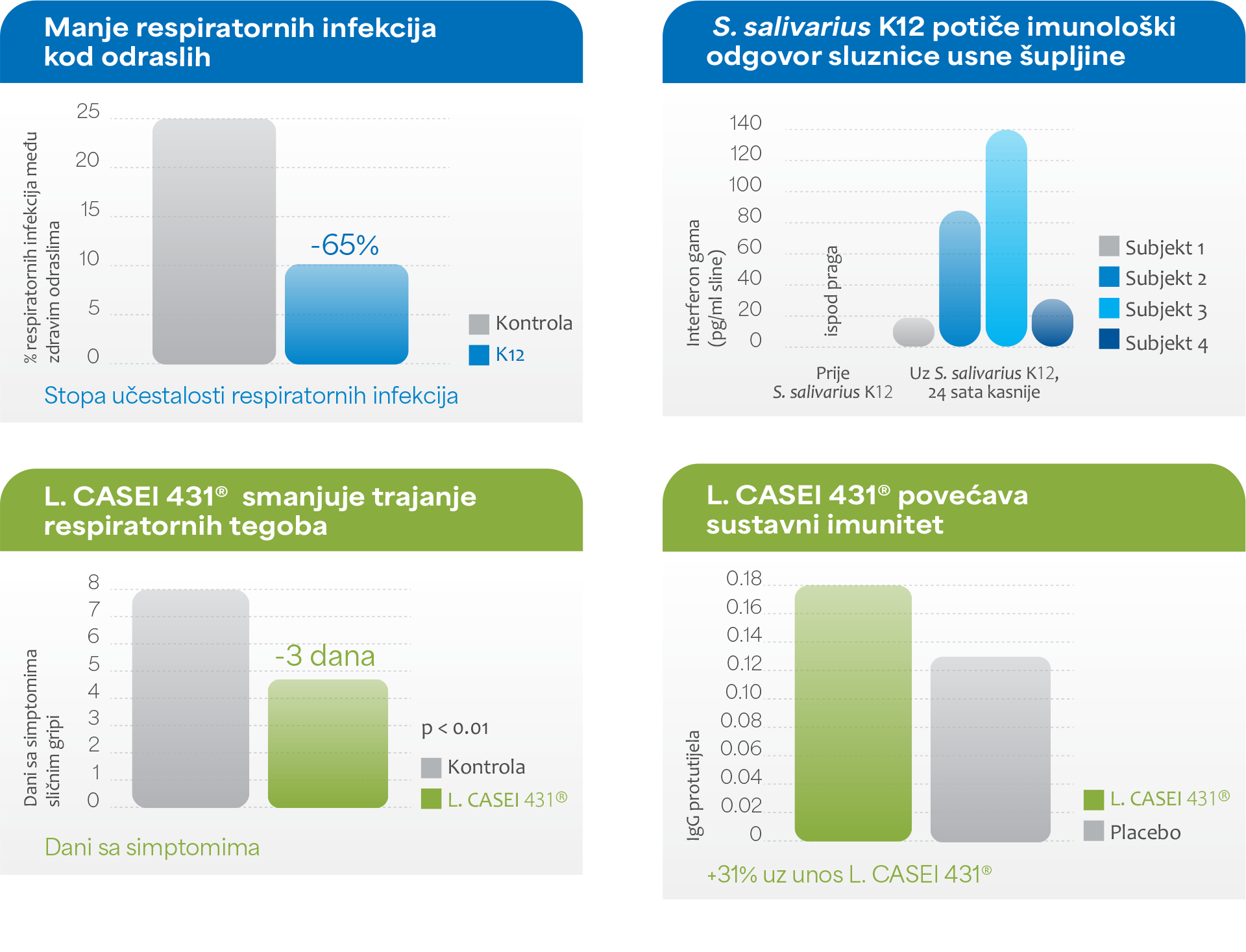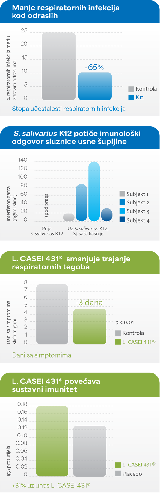 Za razliku od djece, odrasli su osjetljiviji na virusne infekcije gornjih dišnih puteva. Stoga je osim oralne mikrobiote važno podržati i crijevnu mikrobiotu koja utječe ne samo na lokalni odgovor u sluznici, nego i na sustavni imunitet.